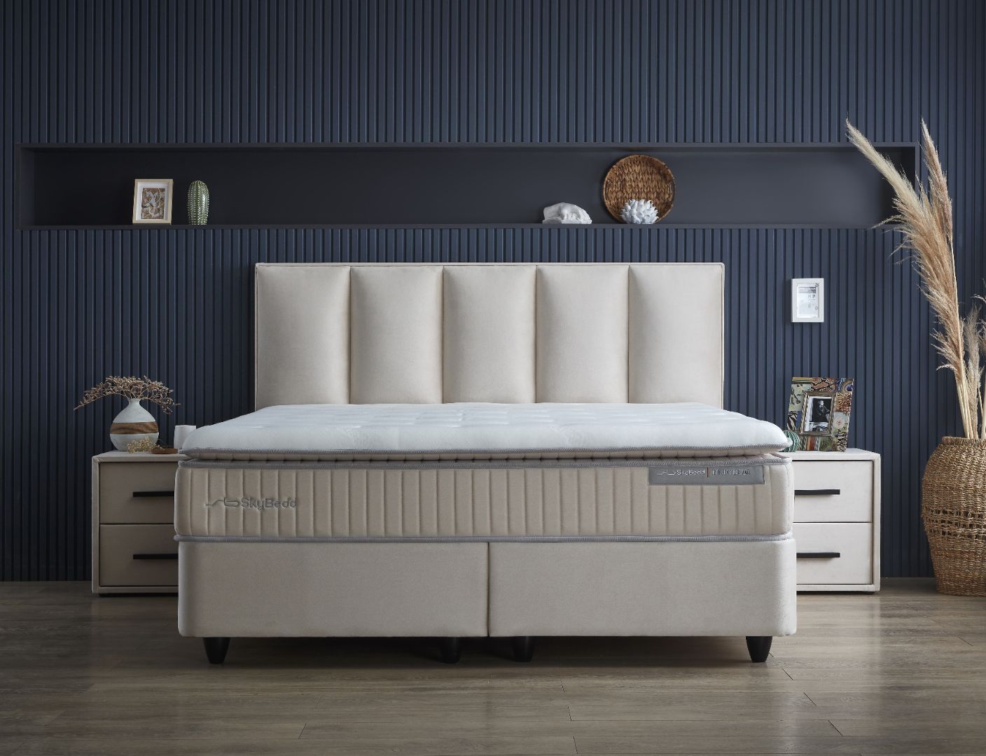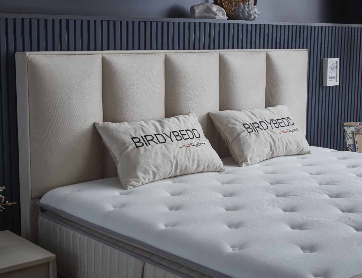Ontdek de verfijnde schoonheid van de Skybedd Birdybedd, een bed dat stijl en comfort perfect combineert. Het klassieke hoofdbord van 126 cm hoog en 9 cm diep is afgewerkt in een luxe geweven stof die een tijdloze uitstraling aan uw slaapkamer verleent. Dit hoofdbord is niet deelbaar en voegt een majestueuze uitstraling toe aan elke zijde van het bed, met een hoogte die elegant boven het bed uitsteekt. Met de keuze voor verschillende tweepersoons afmetingen kunt u dit bed aanpassen aan uw interieur en persoonlijke voorkeuren.