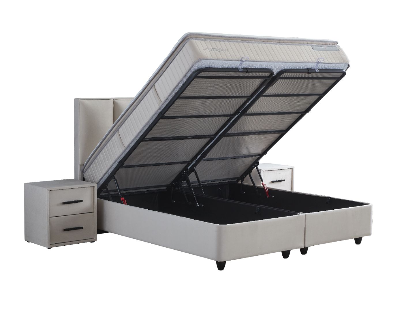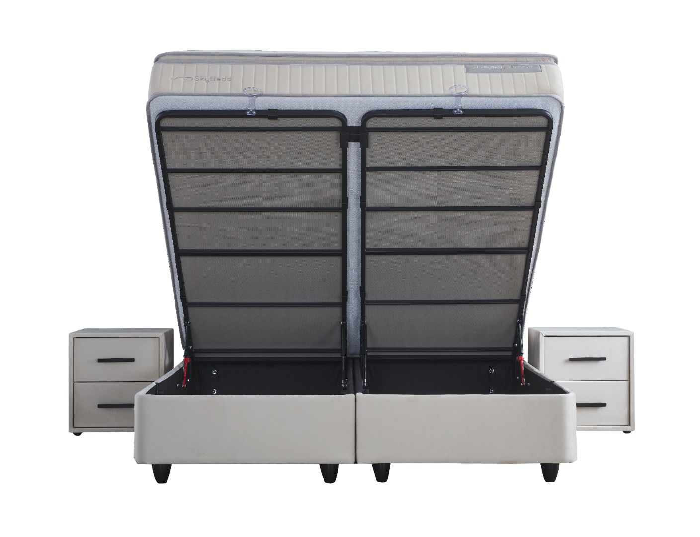 De onderboxen van de Skybedd Birdybedd zijn niet alleen functioneel, maar ook bijzonder praktisch. Met een hoogte van 28 cm en een royale opbergruimte van 840 liter, biedt deze boxspring een ideale oplossing voor het opbergen van beddengoed en andere spullen. De metalen constructie met carbon, voorzien van 4 gasveren van 9000 newton, zorgt voor een soepel openen en sluiten van de opbergruimte. De anti-slip bodem en doorzichtige design handvaten voegen een extra laag van gemak en veiligheid toe aan deze doordachte opbergruimte.